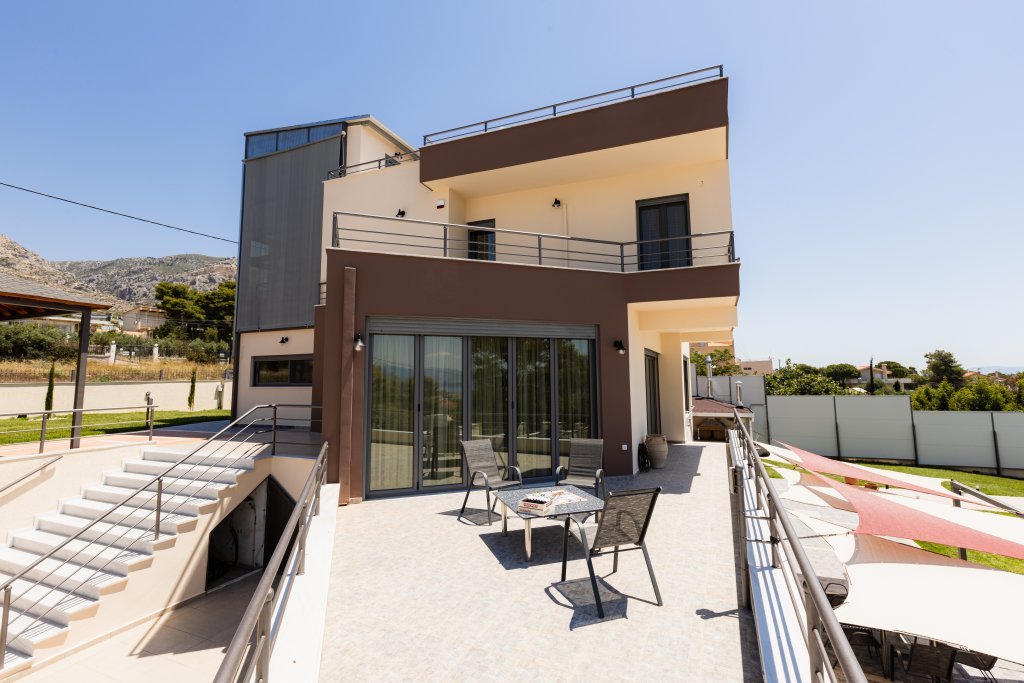 Άνετη βεράντα για χαλάρωση με θέα στους εξωτερικούς χώρους της βίλας.